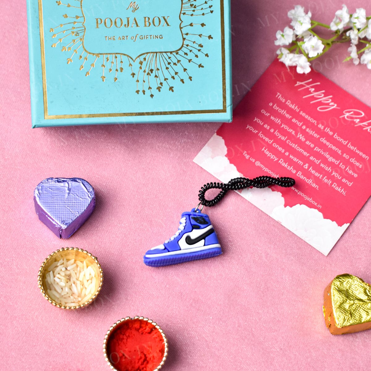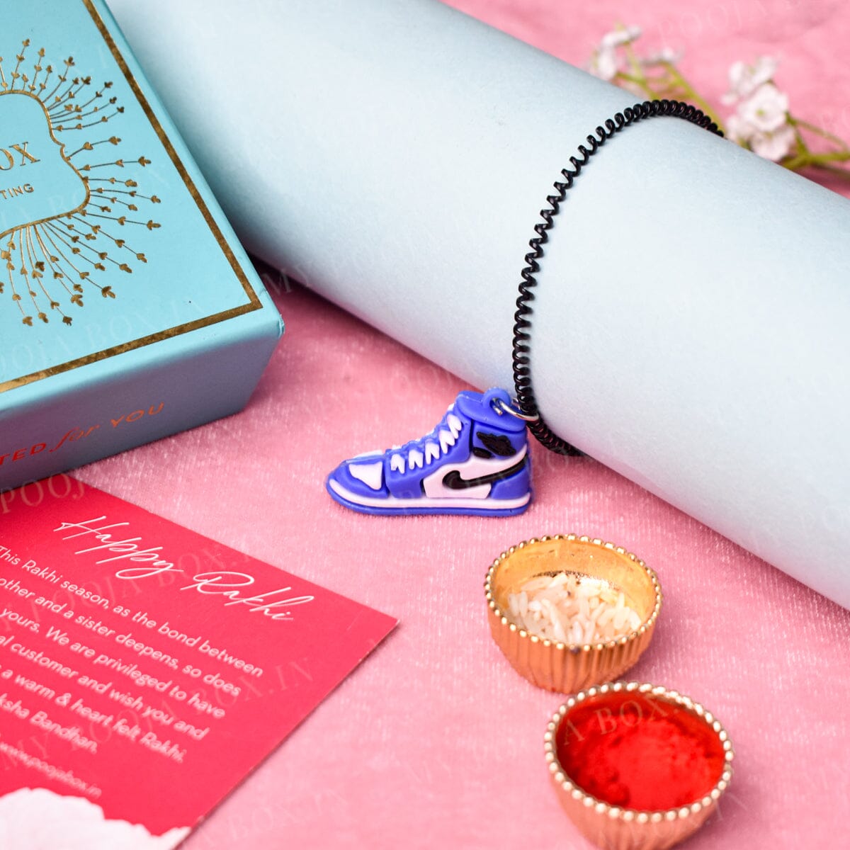 This limited edition Blue Unique Sneaker Rakhi boasts intricate craftsmanship and sophisticated detailing. It's bold color and sleek design capture the essence of modern styling and give it a luxe finish. Show your brother you care with this exclusive piece -- perfect for any stylish Raksha Bandhan celebration.