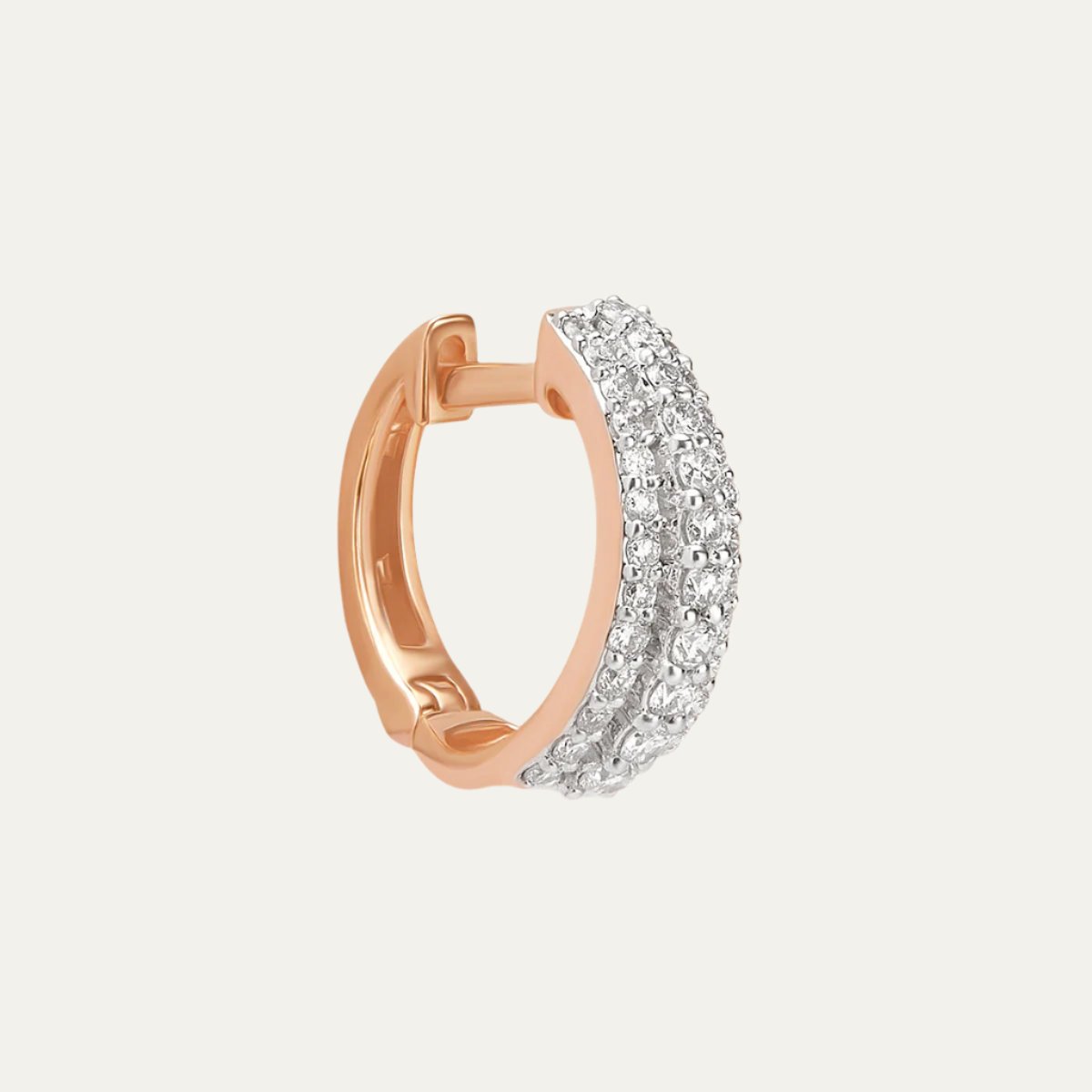 Embrace everlasting elegance with our "Eternity Whispers" huggie earrings in high-polish rose gold. Two rows of small pave diamonds gracefully encircle a center of larger round diamonds, creating a harmonious blend of delicacy and brilliance. Illuminate your style with these timeless huggies, a symbol of enduring charm and sophistication.