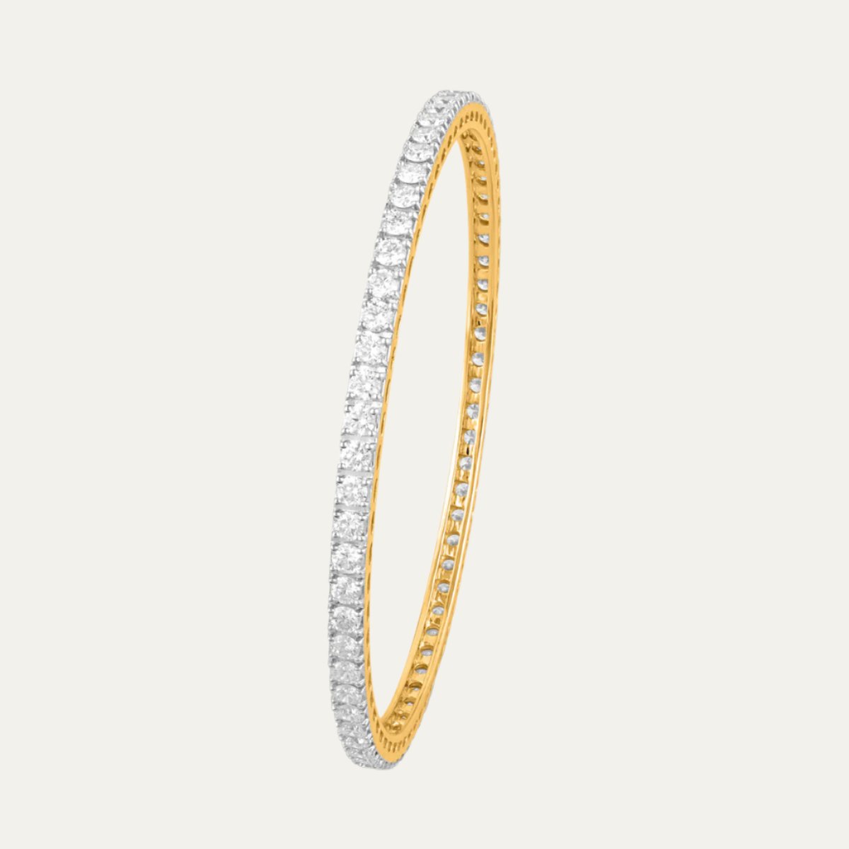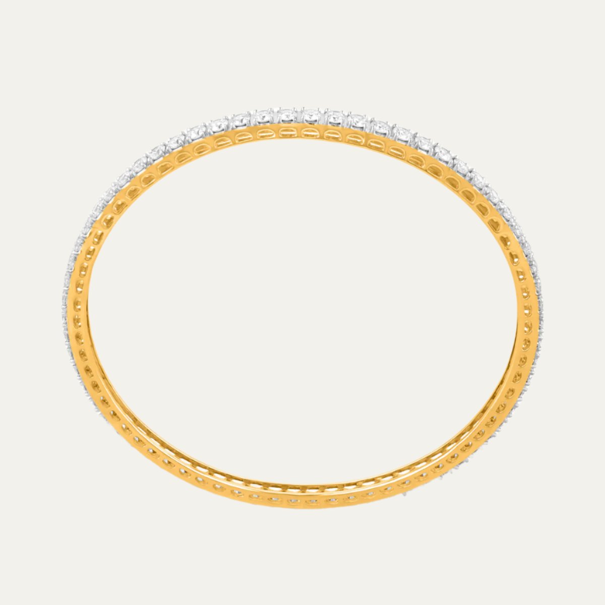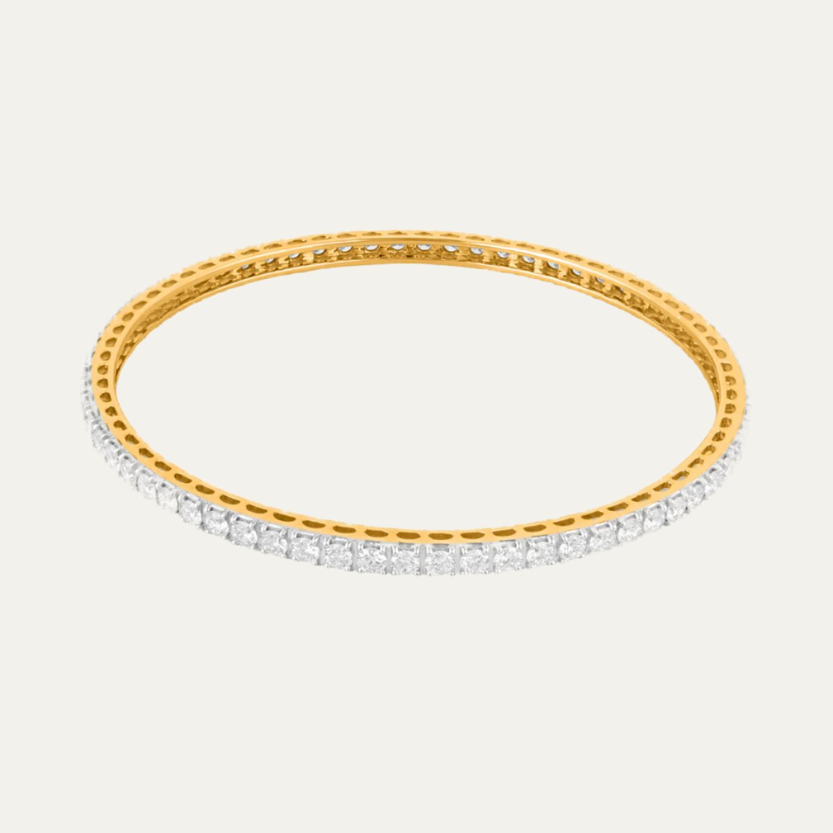 Glistening diamonds crafted in a 4-prong gallery collet adorn this exquisite line bangle made from high-polish gold. Let the eternal sparkle of this diamond bangle grace your wrist and make you shine.