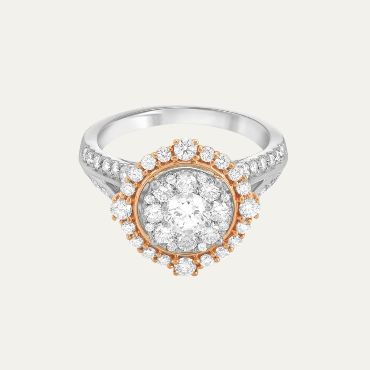Revel in luxury with our Ros‚ Blanc Cluster Elegance ring, a fusion of rose and white gold. Small pave-set diamonds create the illusion of a solitaire, surrounded by a halo. A masterpiece from our Dual Gold Collection, offering sophistication and charm. Illuminate your hand with the timeless allure of grown diamond jewellery.