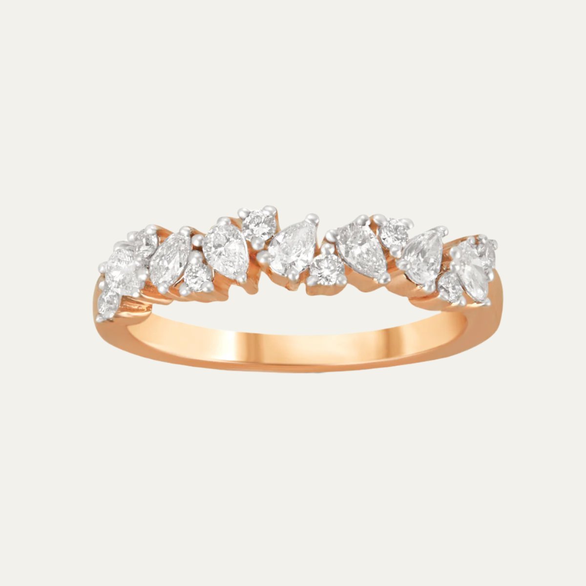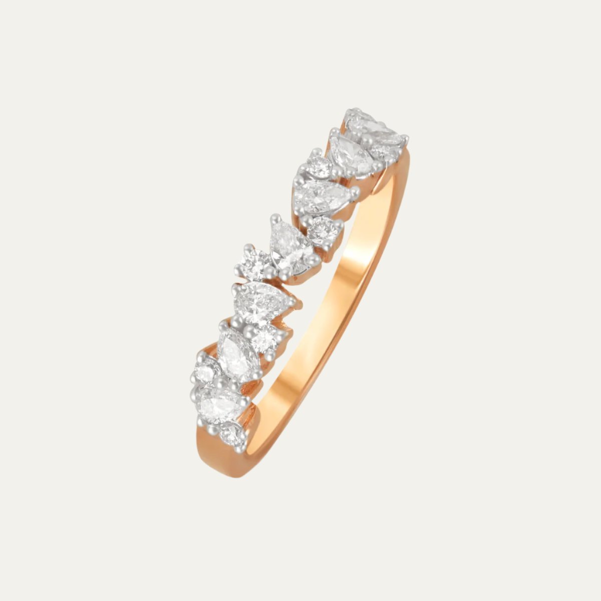 A mesmerizing half eternity ring crafted in high-polish gold, adorned with exquisite fancy-cut diamonds. An elegant symphony of romance and luxury for your fingers.