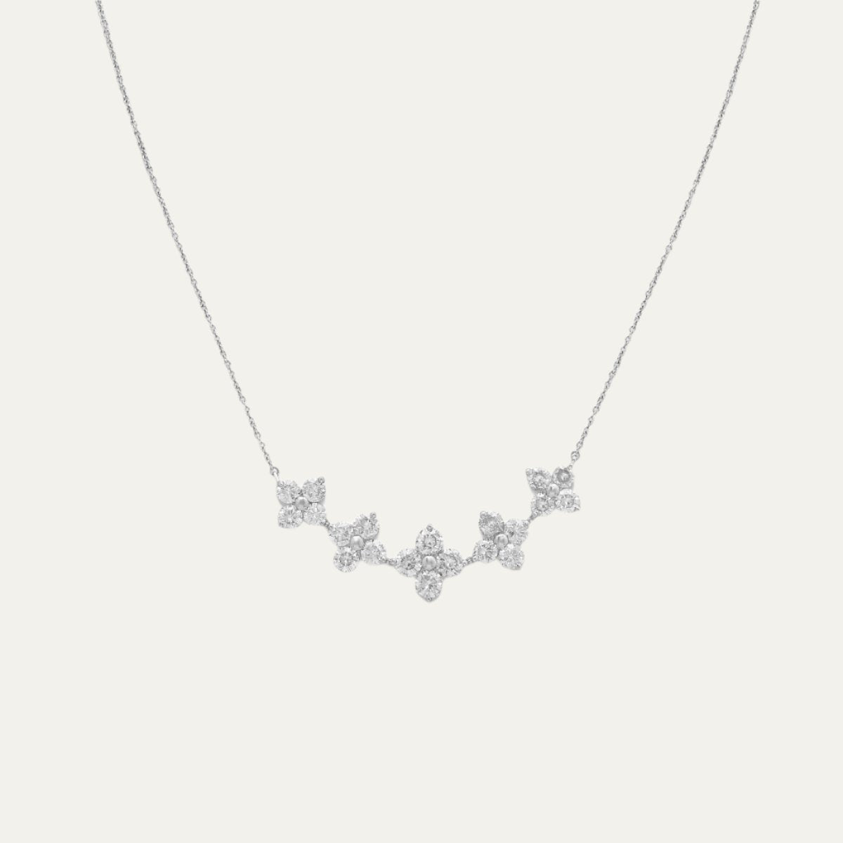 Fleur de Luxe: High-polish white gold necklet featuring a centerpiece of five units of 4-petal flowers set in prong setting, gracefully extending into a fine cable chain.