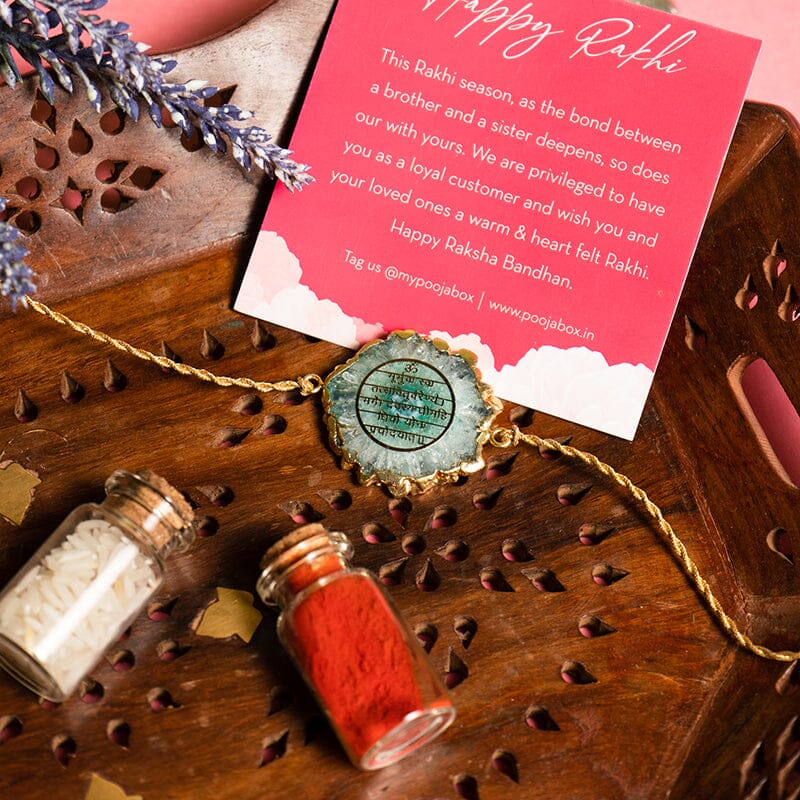 This beautiful auspicious Rakhi comes with a gorgeous colorful agate stone centerpiece that has the Gayatri Mantra written on it. Tie this rakhi around your brother's wrist to bless him with the love of god. This product includes: