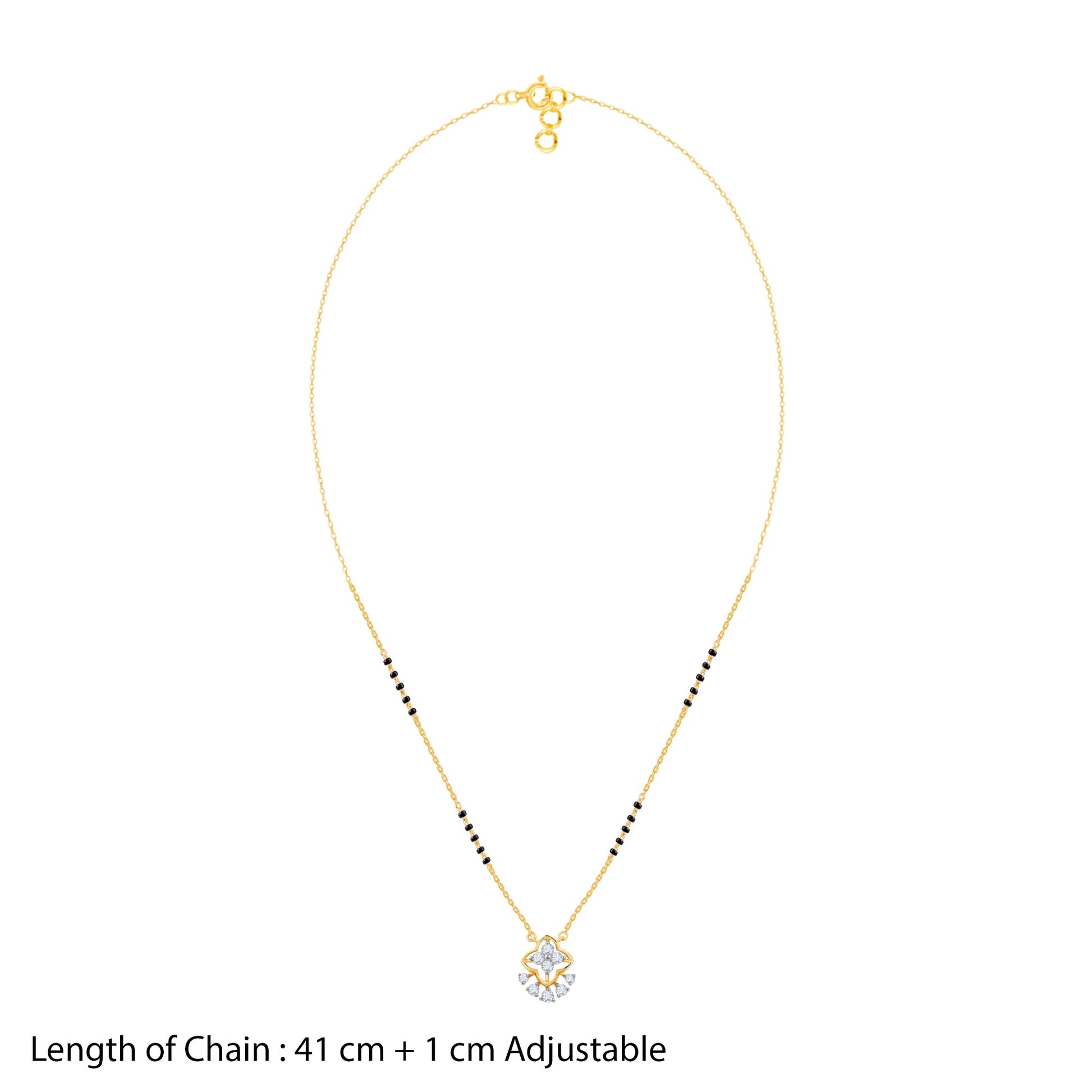This pure gold mangalsutra for women features a classic black beaded chain, leading to a gold pendant. The pendant showcases a central, stylised floral design studded with lab grown diamonds.