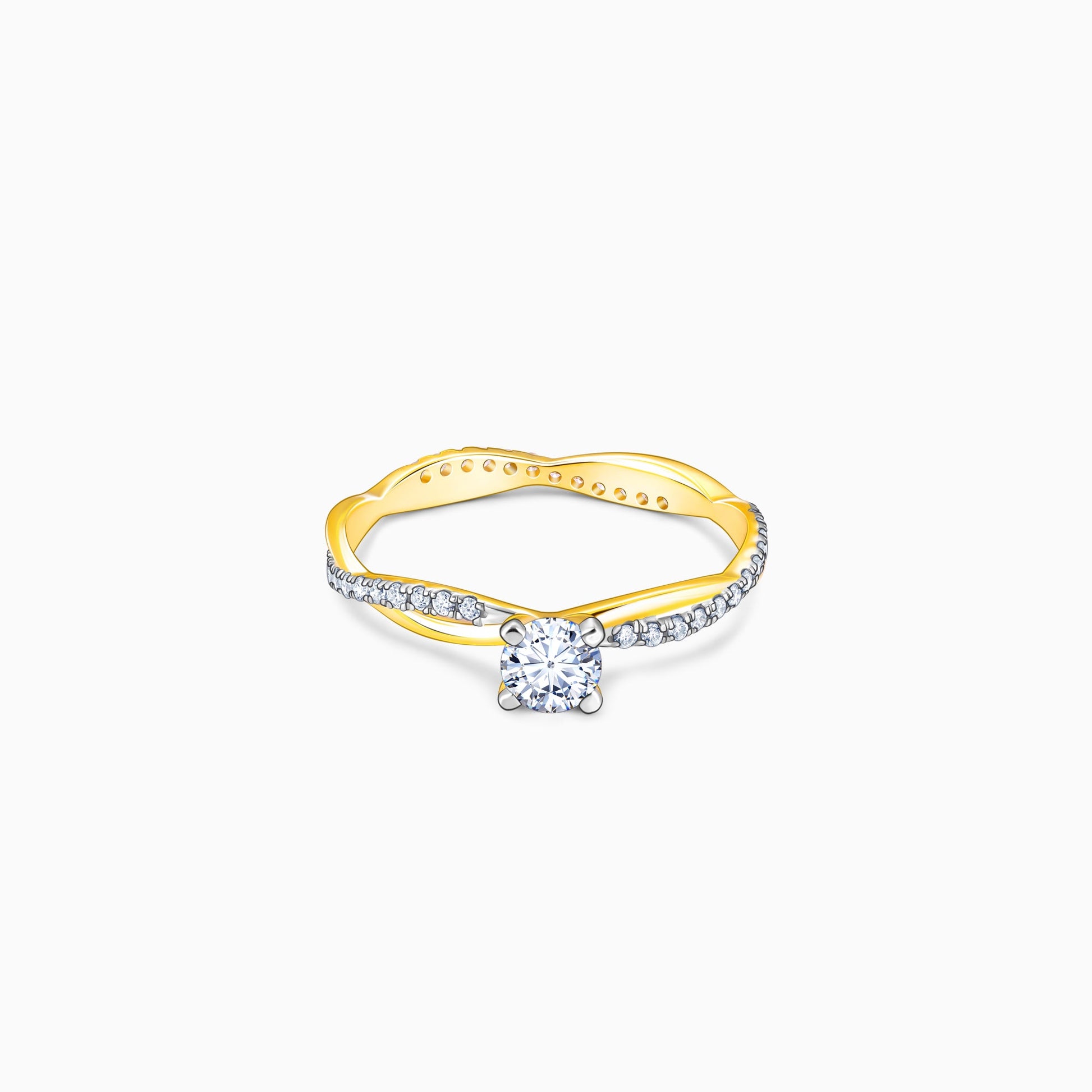 This gold ring has a bigger diamond at the centre and intertwining bands studded with smaller diamonds.