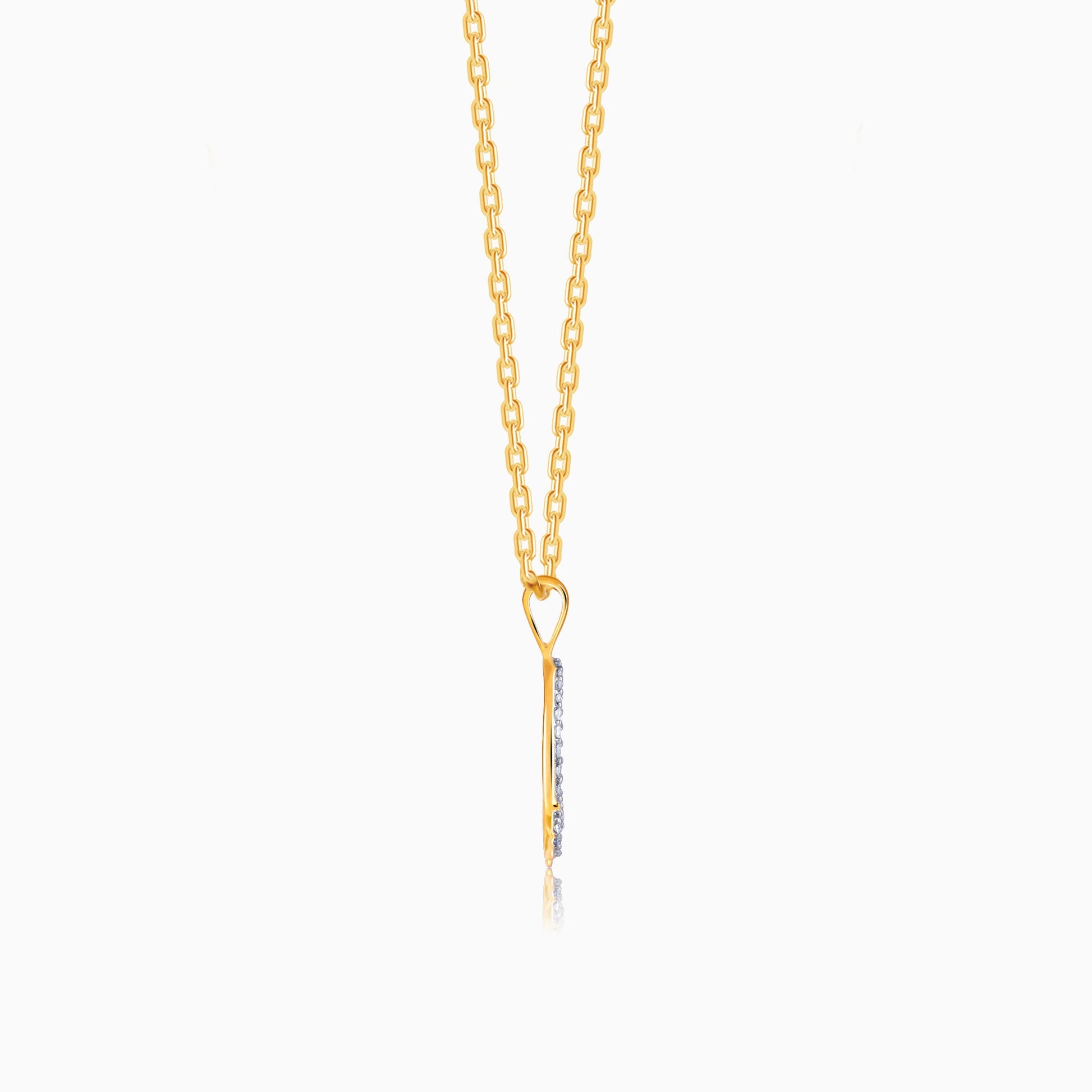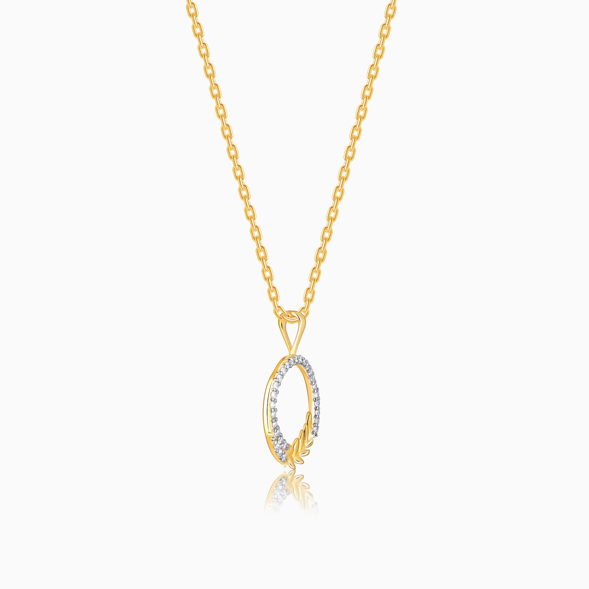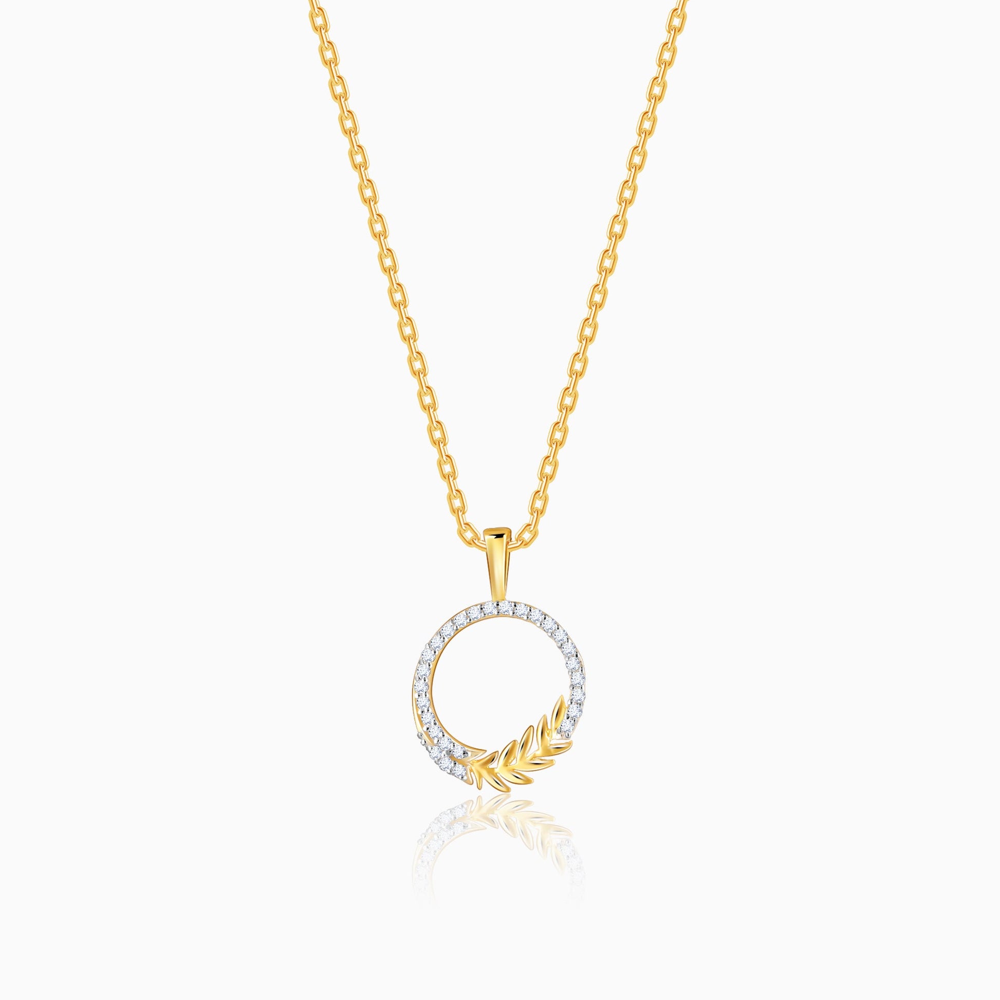 This pure gold pendant for women features a hollowed out circular motif with lab grown diamond in a pave setting. A leafy motif in gold graces the lower part of the circle.