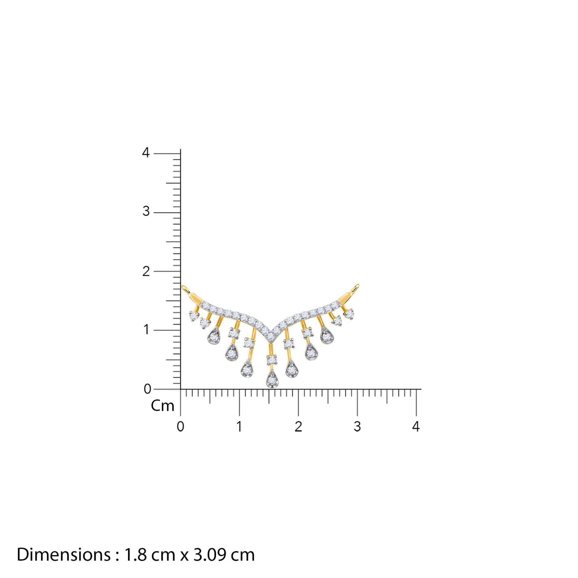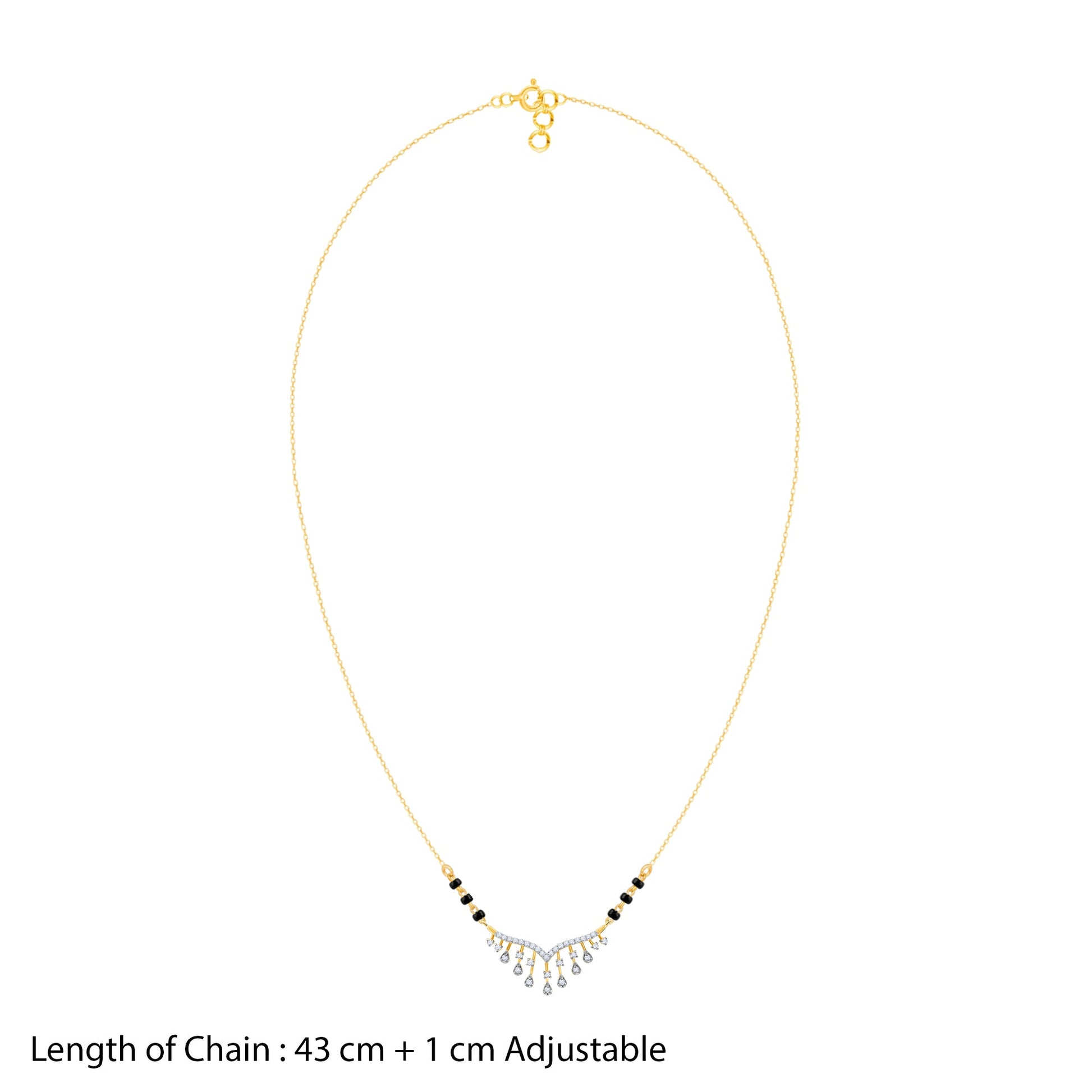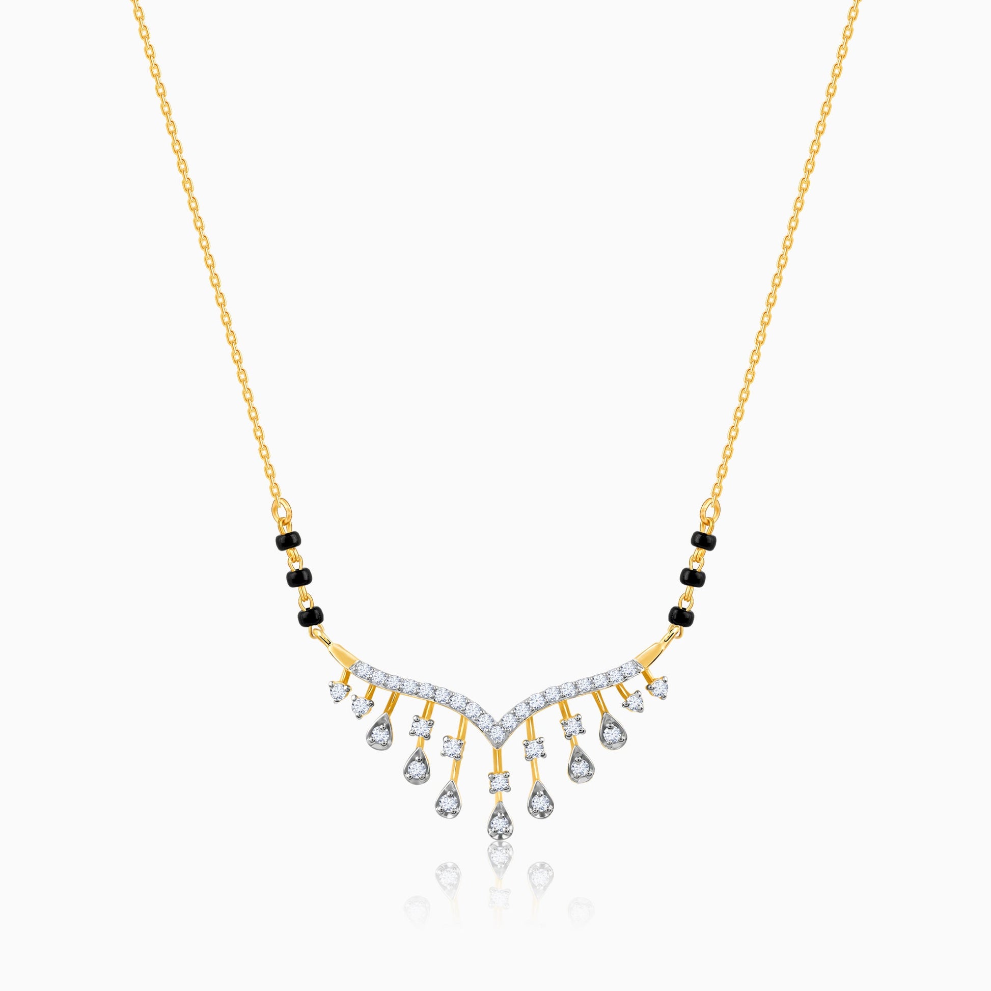 This pure gold mangalsutra features a V-shaped design with a central row of graduated lab grown diamonds, accented by alternating lab grown diamond shapes and dangling pear-shaped drops.