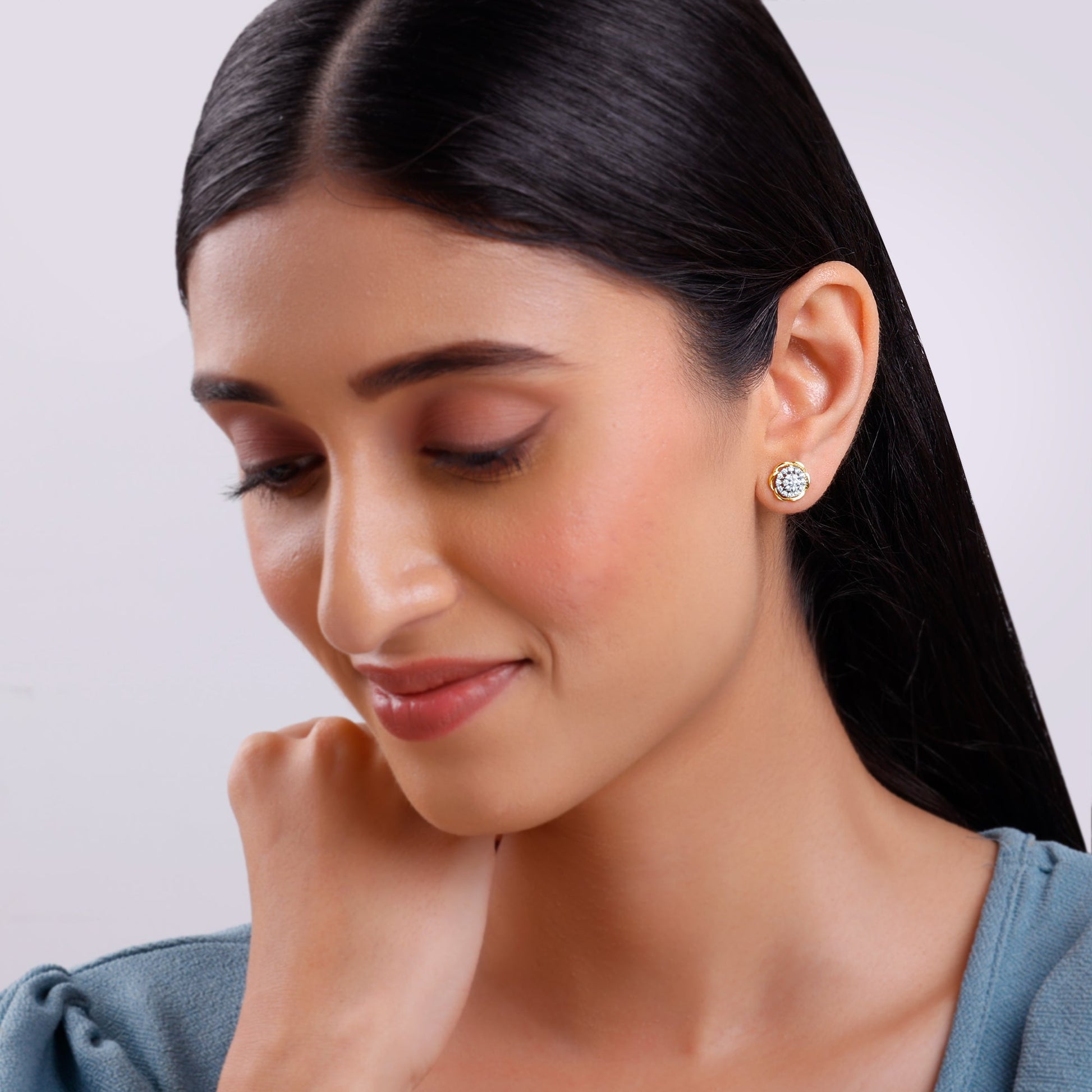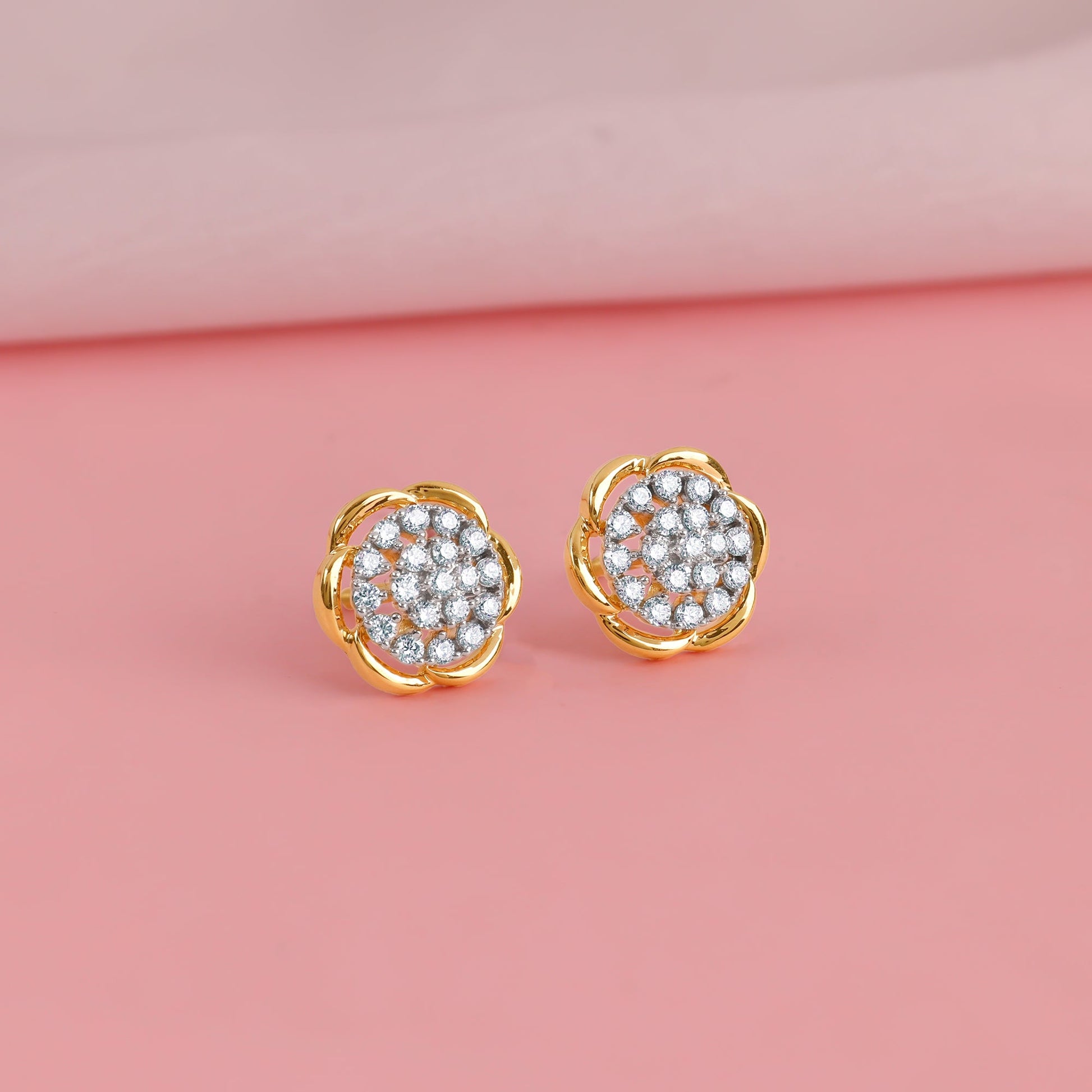 These pure gold earrings for women feature an outline of a blooming floral motif with a cluster of lab grown diamonds forming the core.