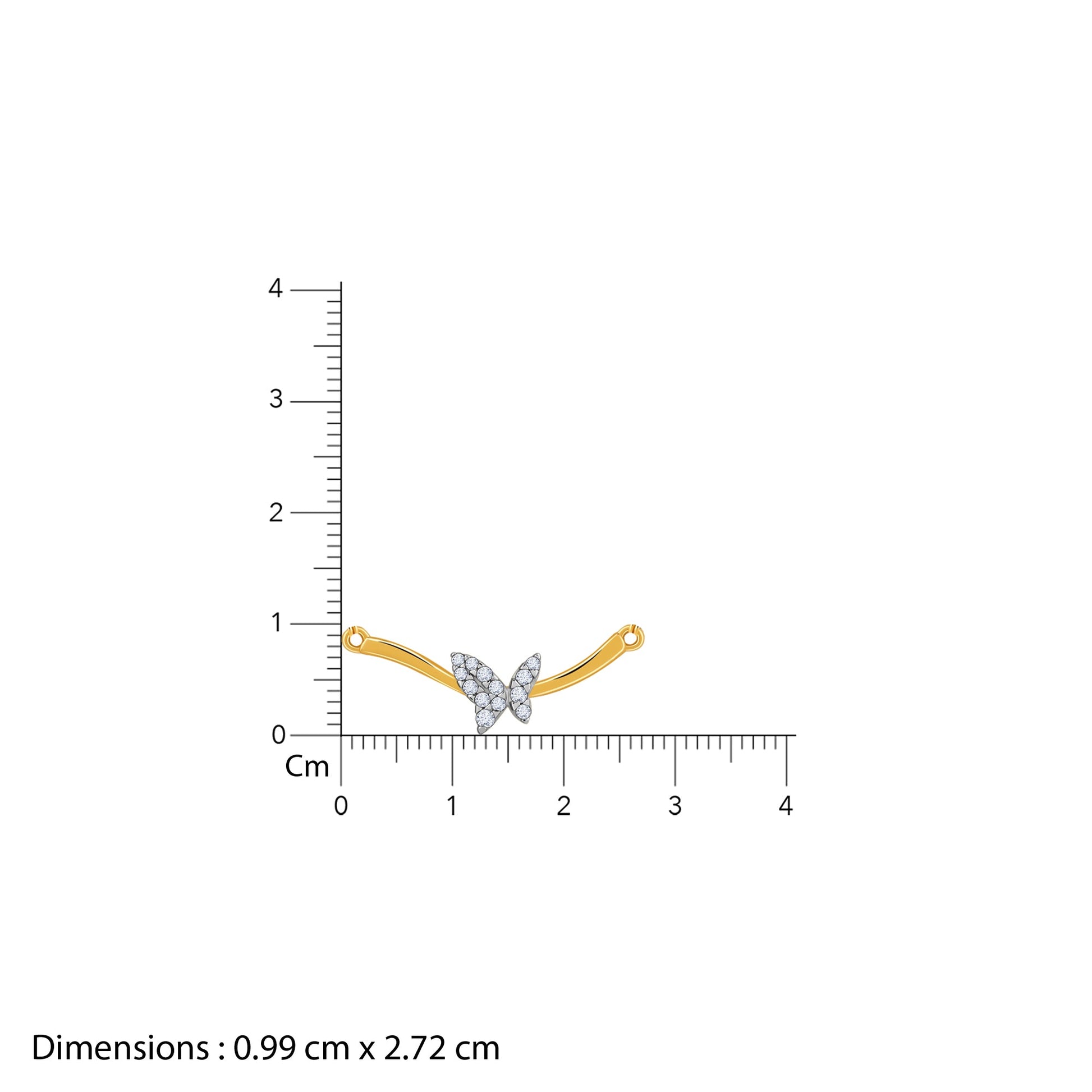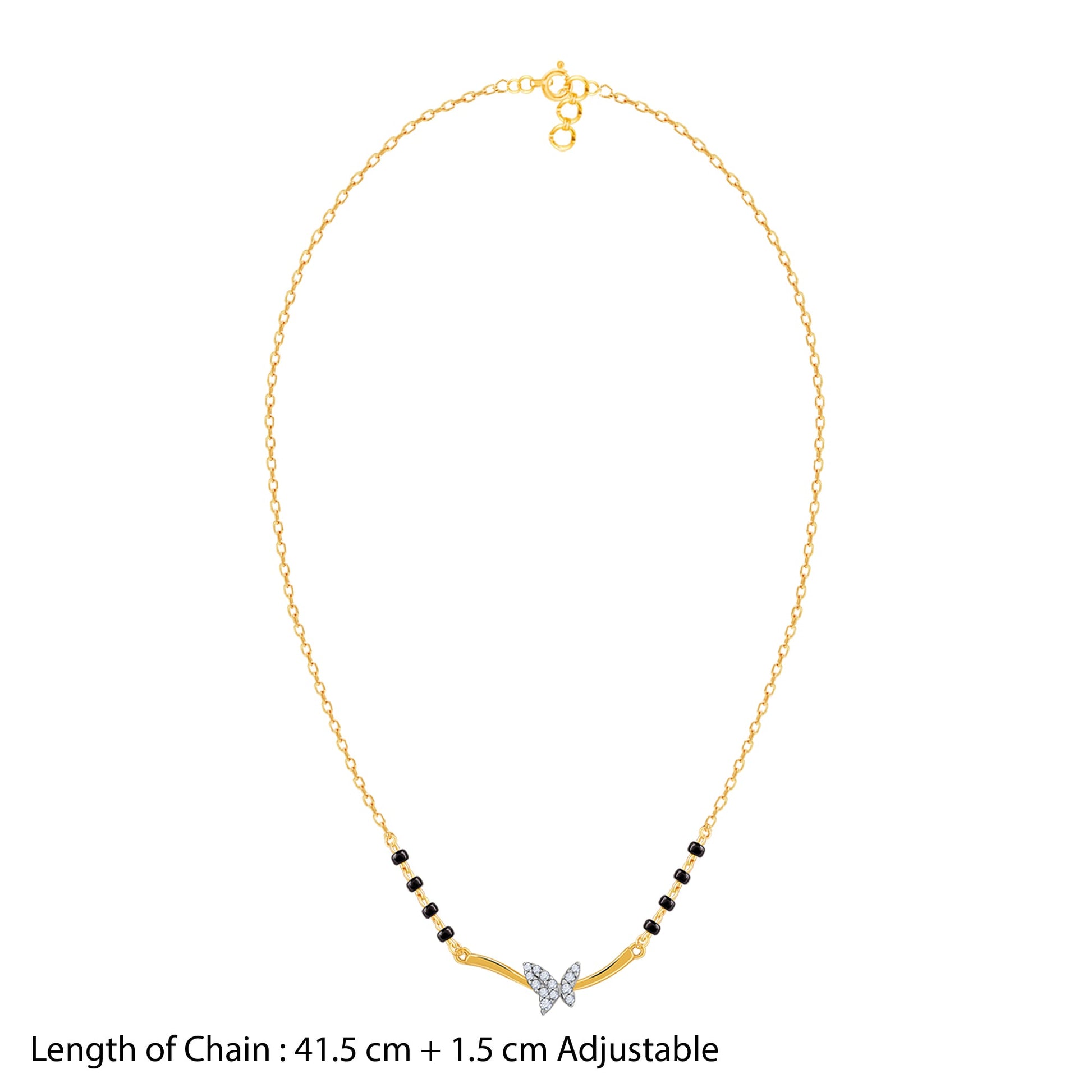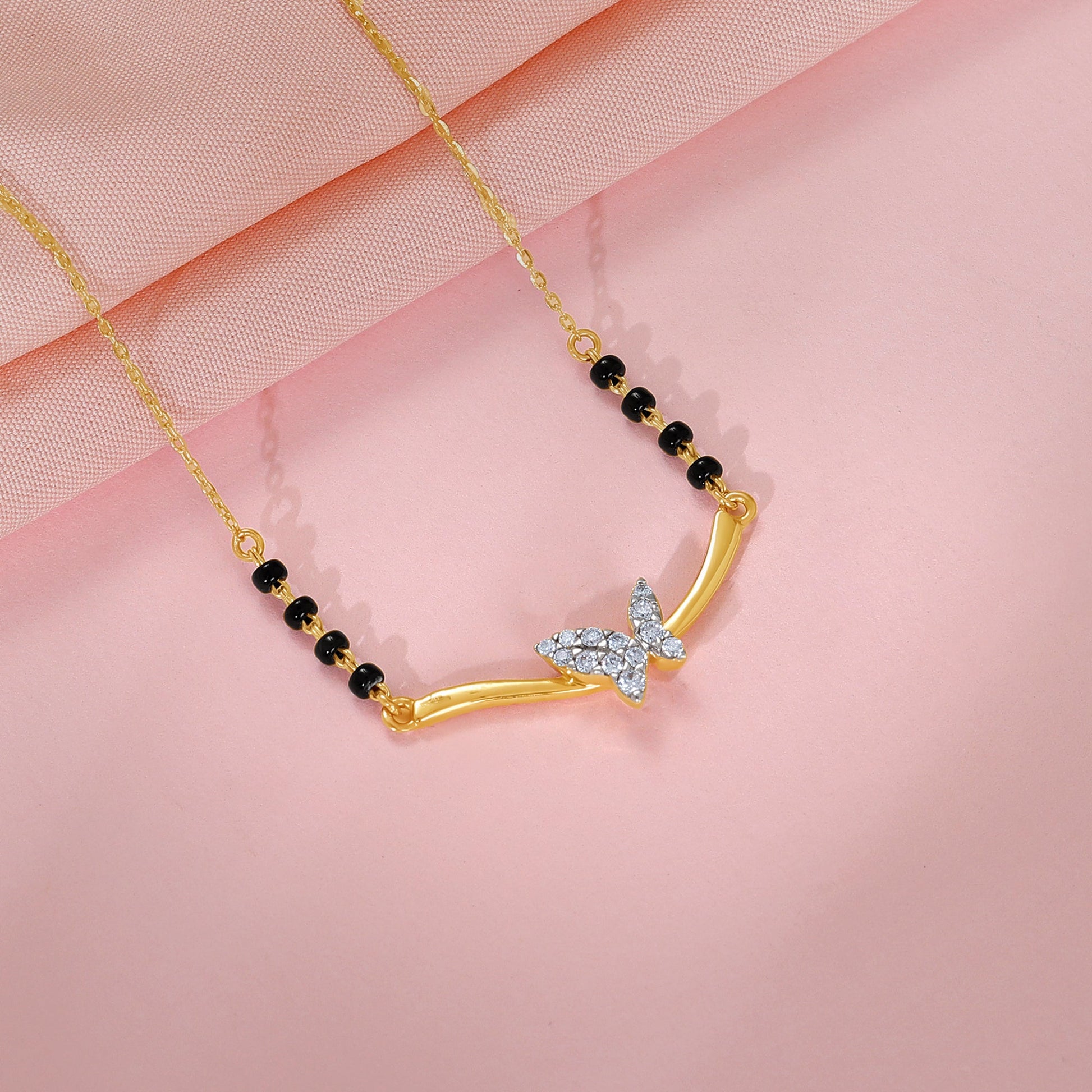 This pure gold mangalsutra for women features a gold chain with traditional black beads, leading to a curved gold pendant. The pendant showcases a central, pave set lab grown diamond butterfly motif adding a touch of contemporary charm to this timeless piece.