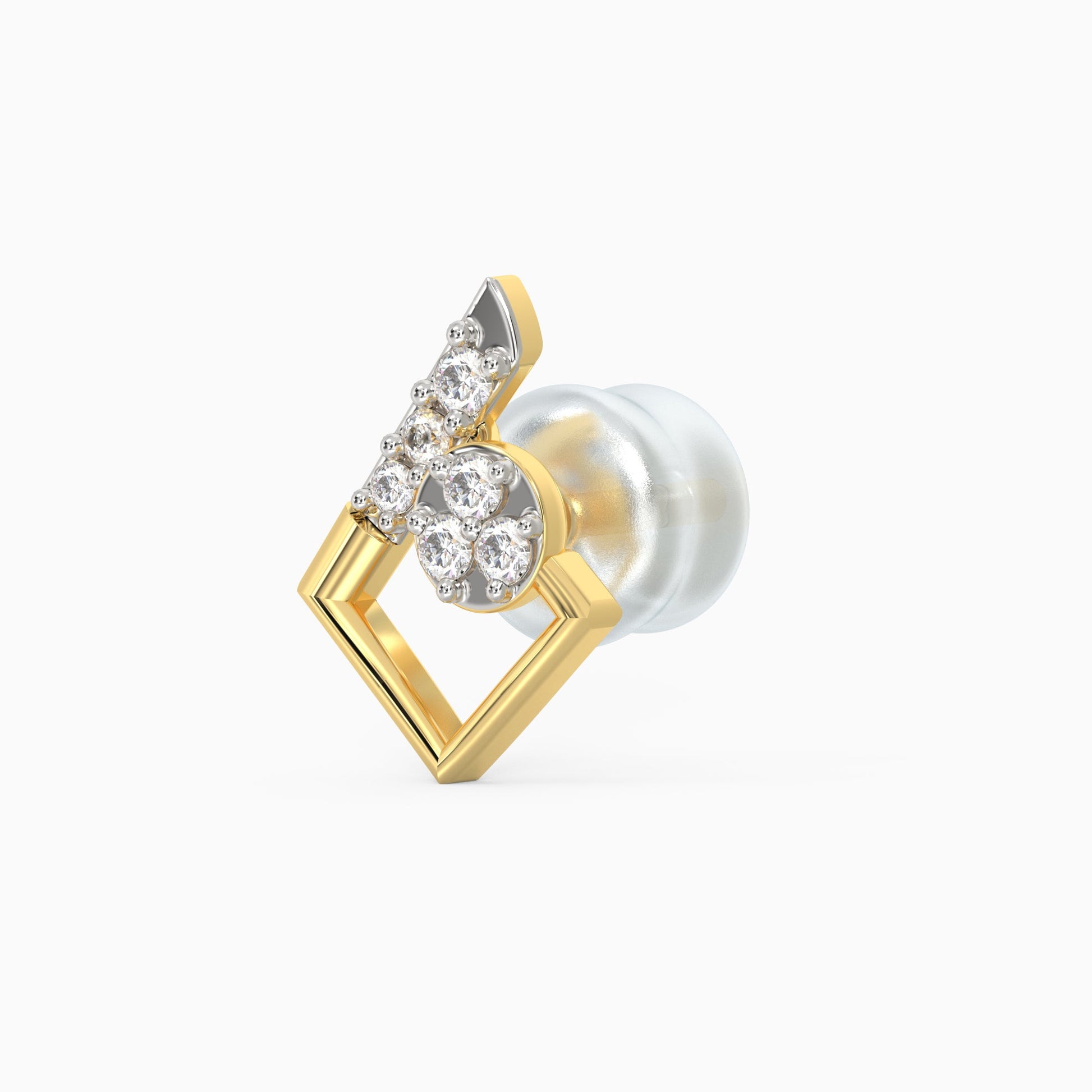 These gold earrings feature a rhombus motif with a circle and line design in the top vertex adorned with lab-grown diamonds.