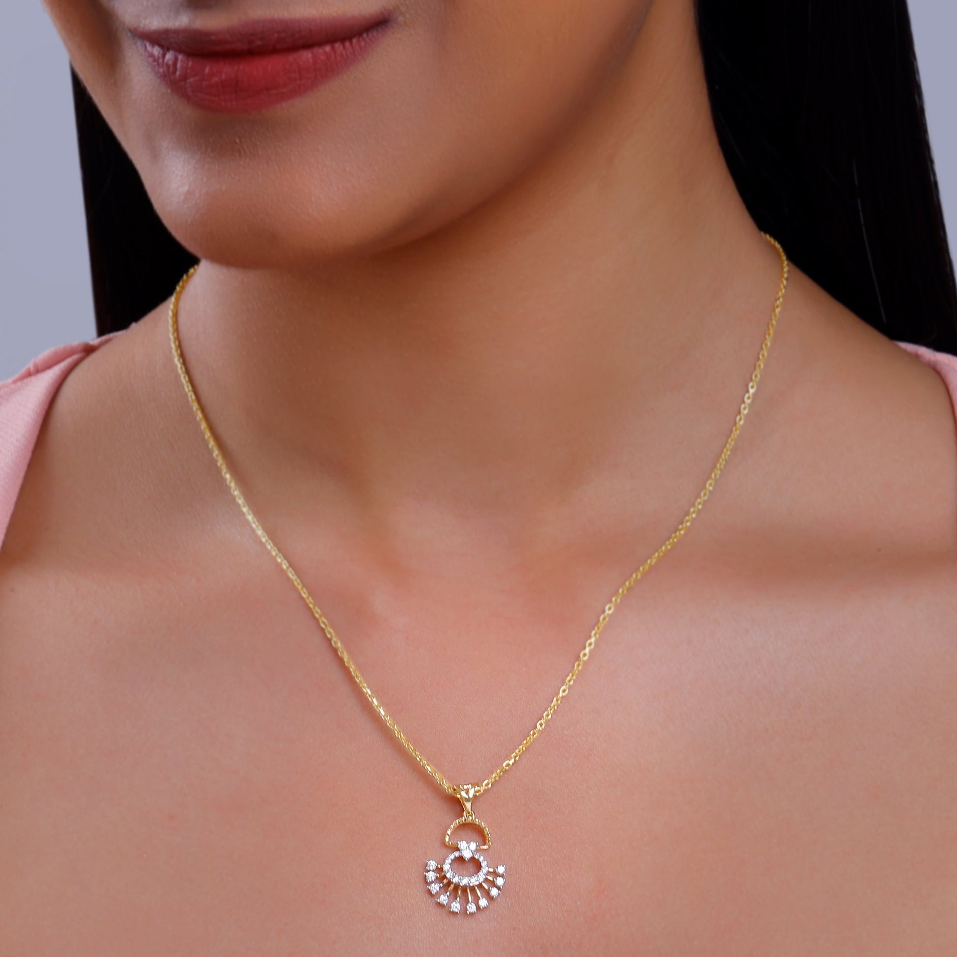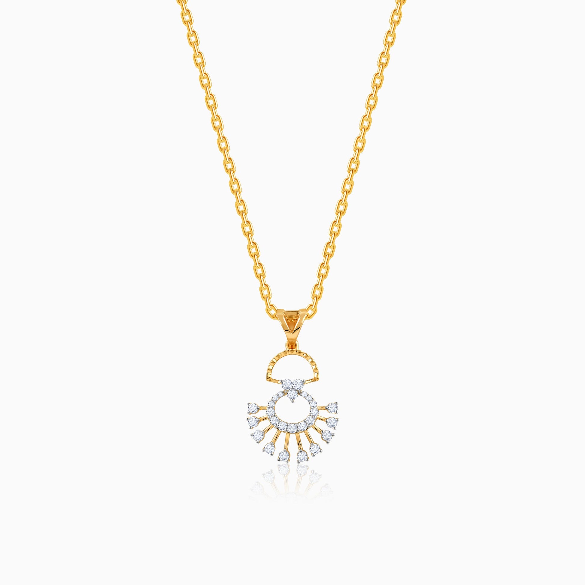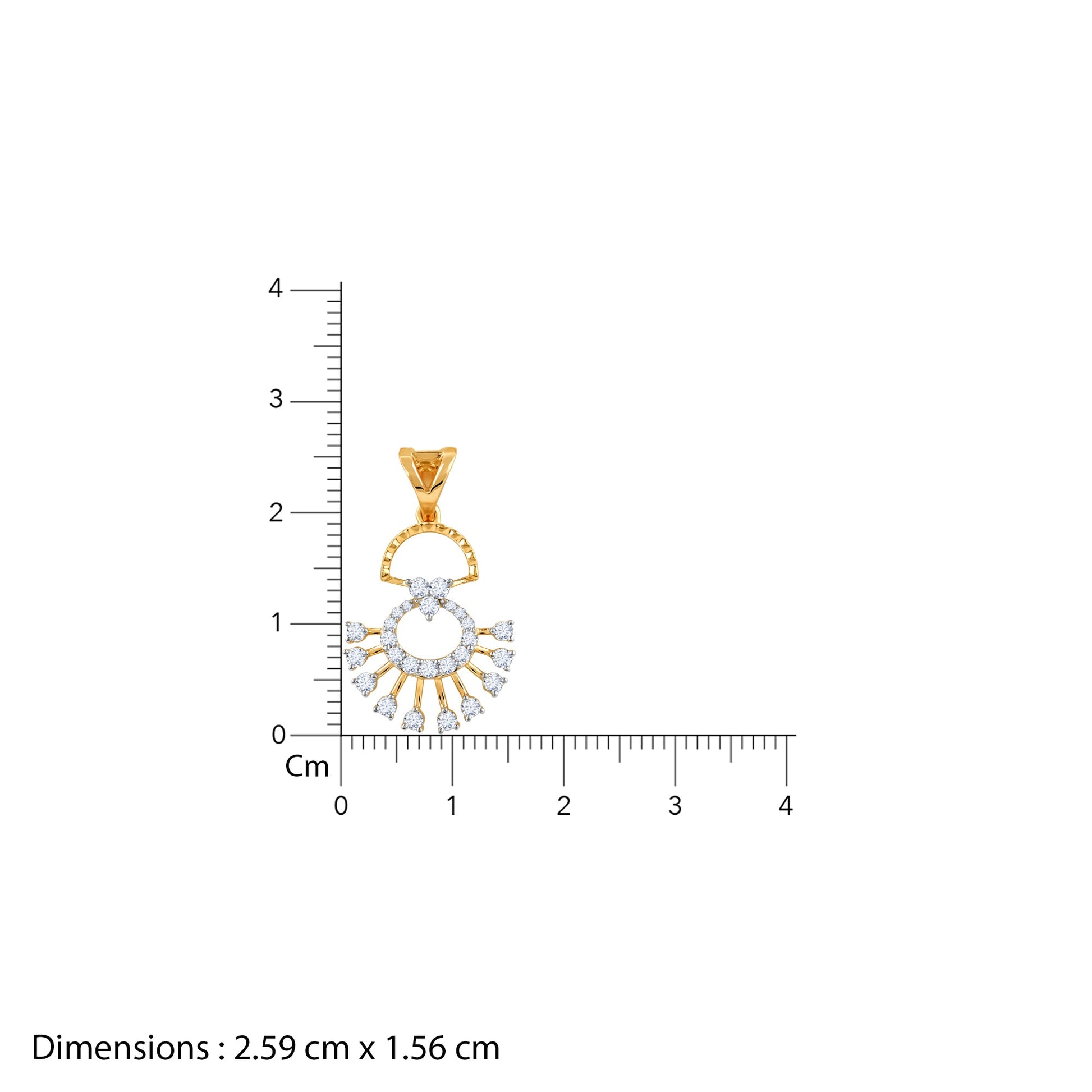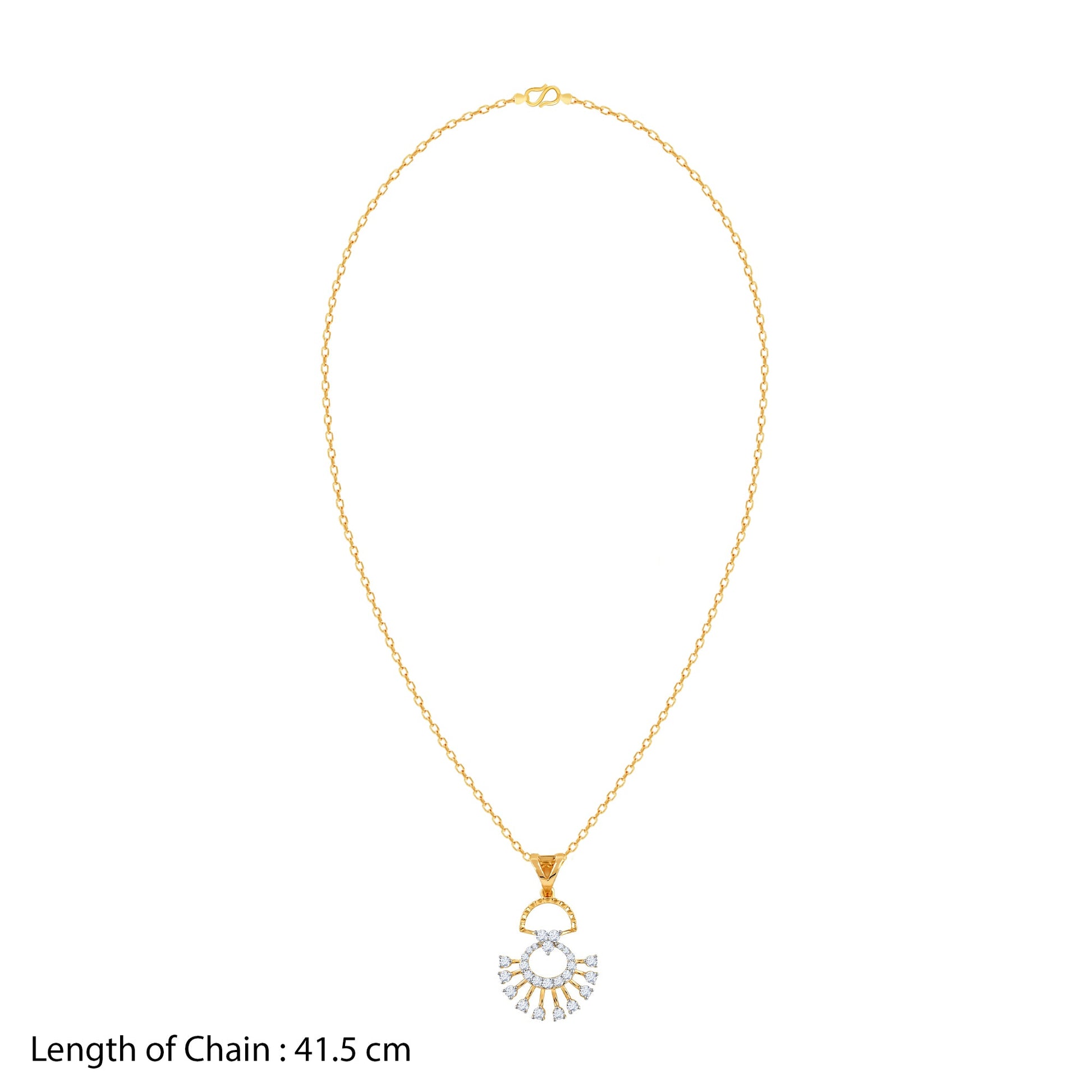 This pure gold pendant for women features a dandelion-like motif studded with lab diamonds hanging from a semi-circle.