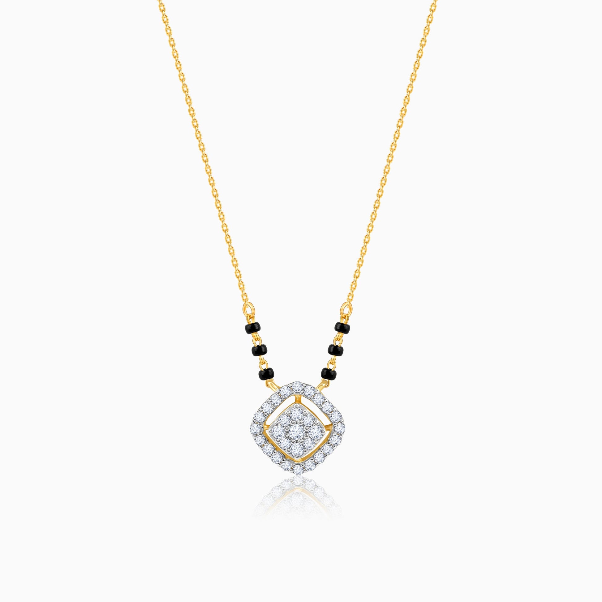 This pure gold mangalsutra for women features a square-shaped pendant with a central cluster of lab grown diamonds, surrounded by a double halo of smaller lab diamonds for enhanced sparkle. The chain is interspersed with traditional black beads on both sides, adding a classic touch.