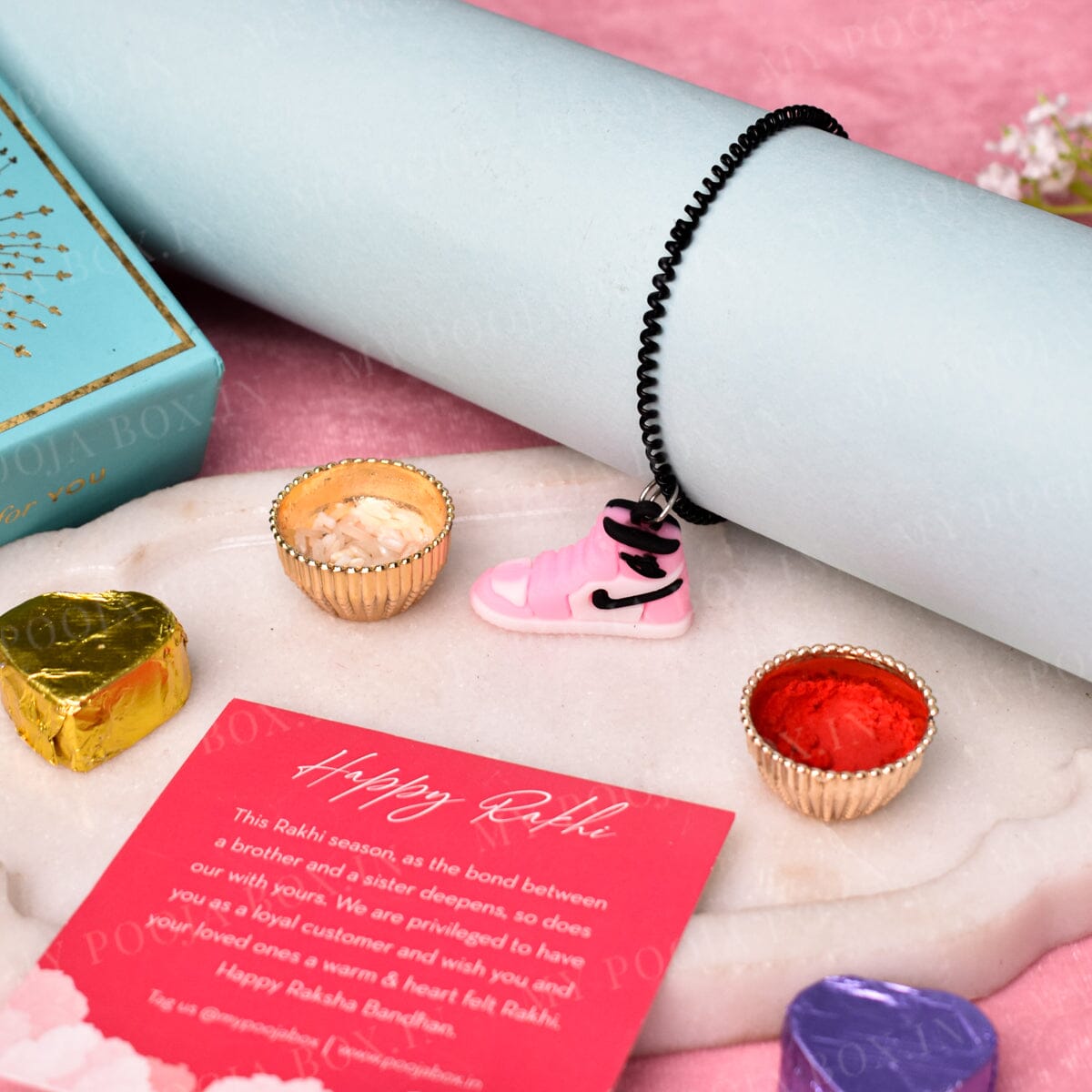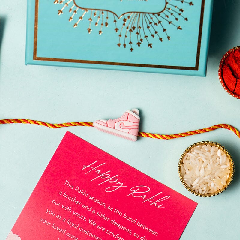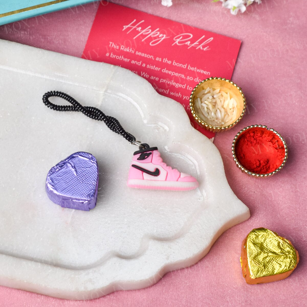 Celebrate this special occasion with the Pink Sneaker Rakhi, the perfect accessory that will glamorize your brother's wrist. Embellished with a classic pink color, this rakhi will bring style and sophistication to the festivities. Handcrafted with exquisite detail, the Pink Sneaker Rakhi is the perfect combination of elegance and class.