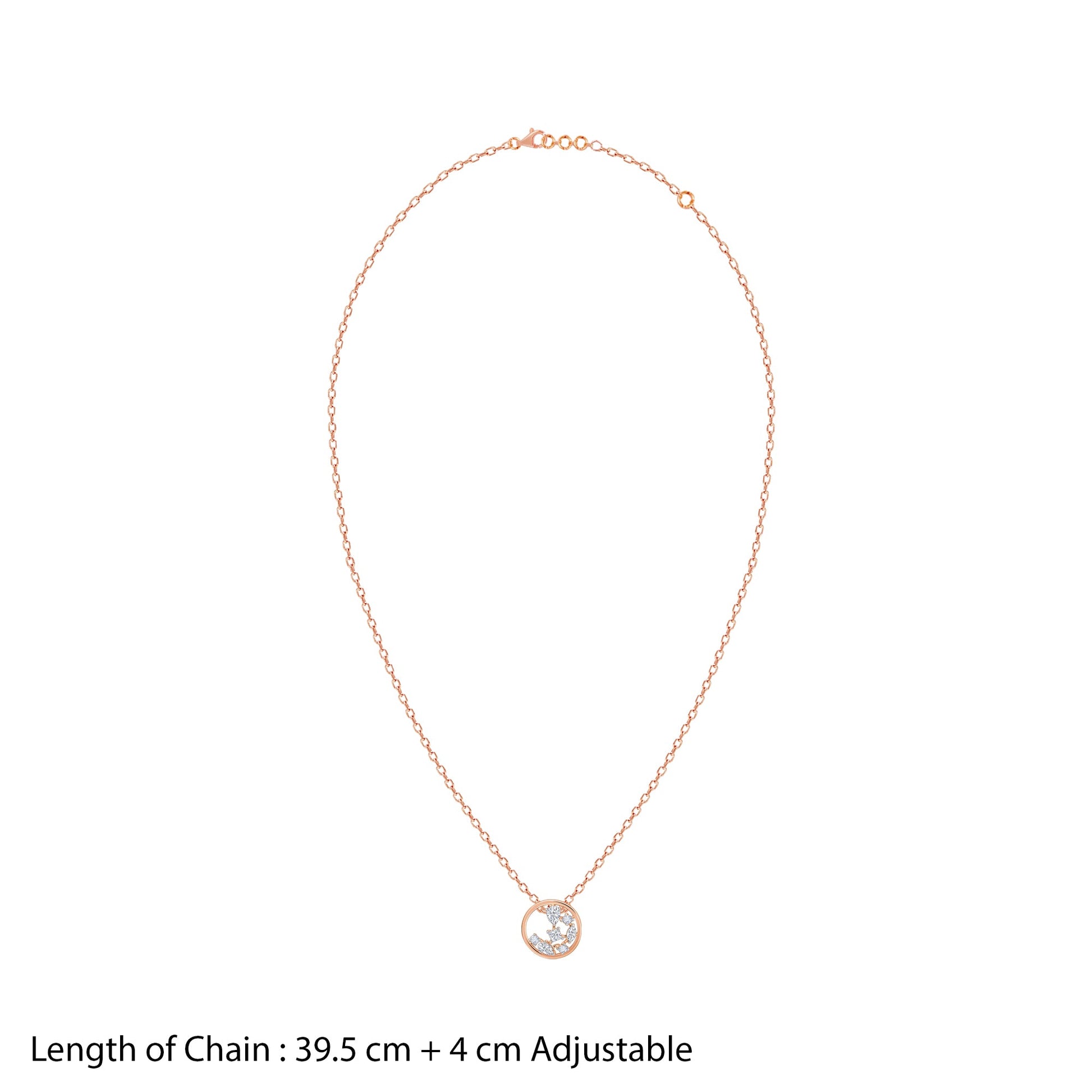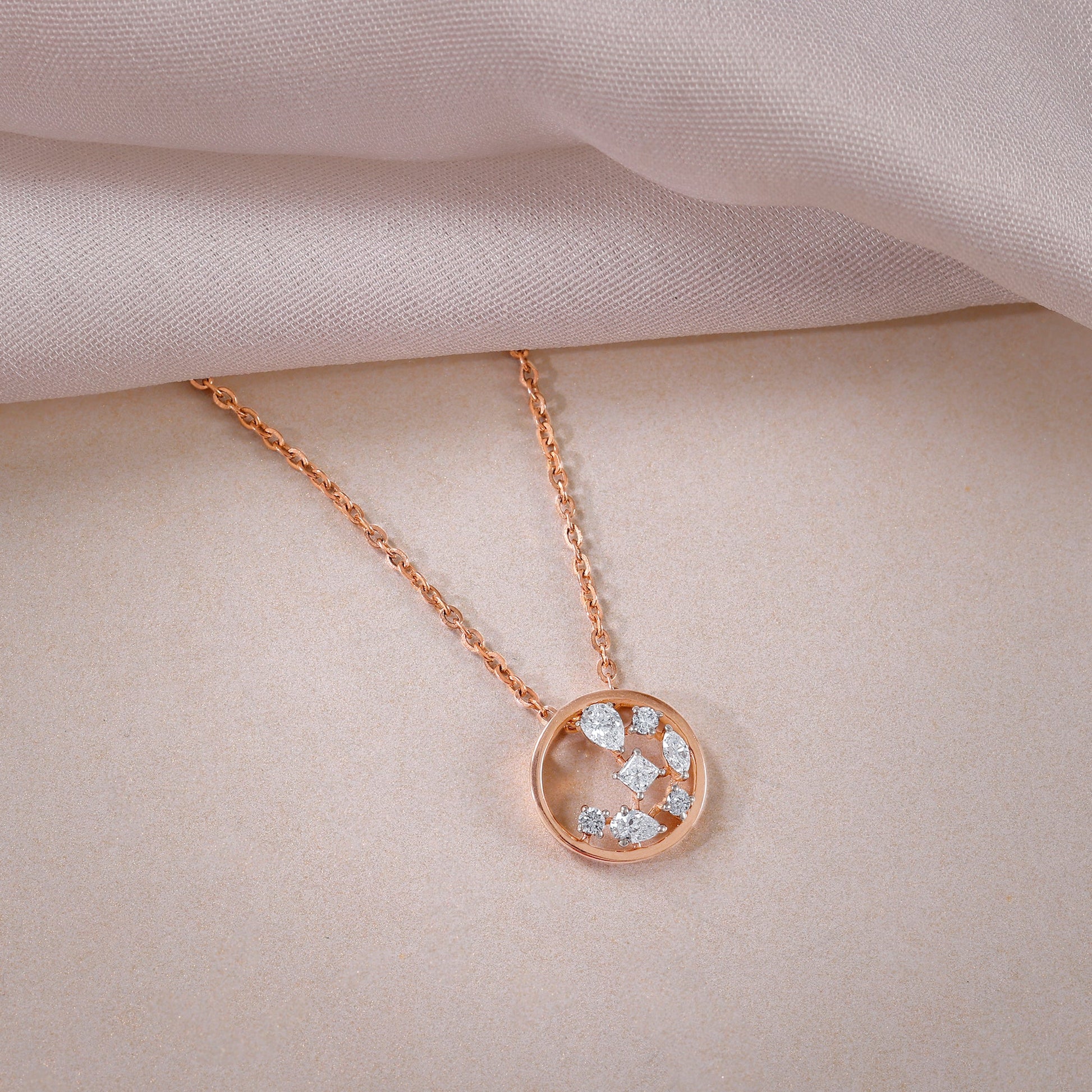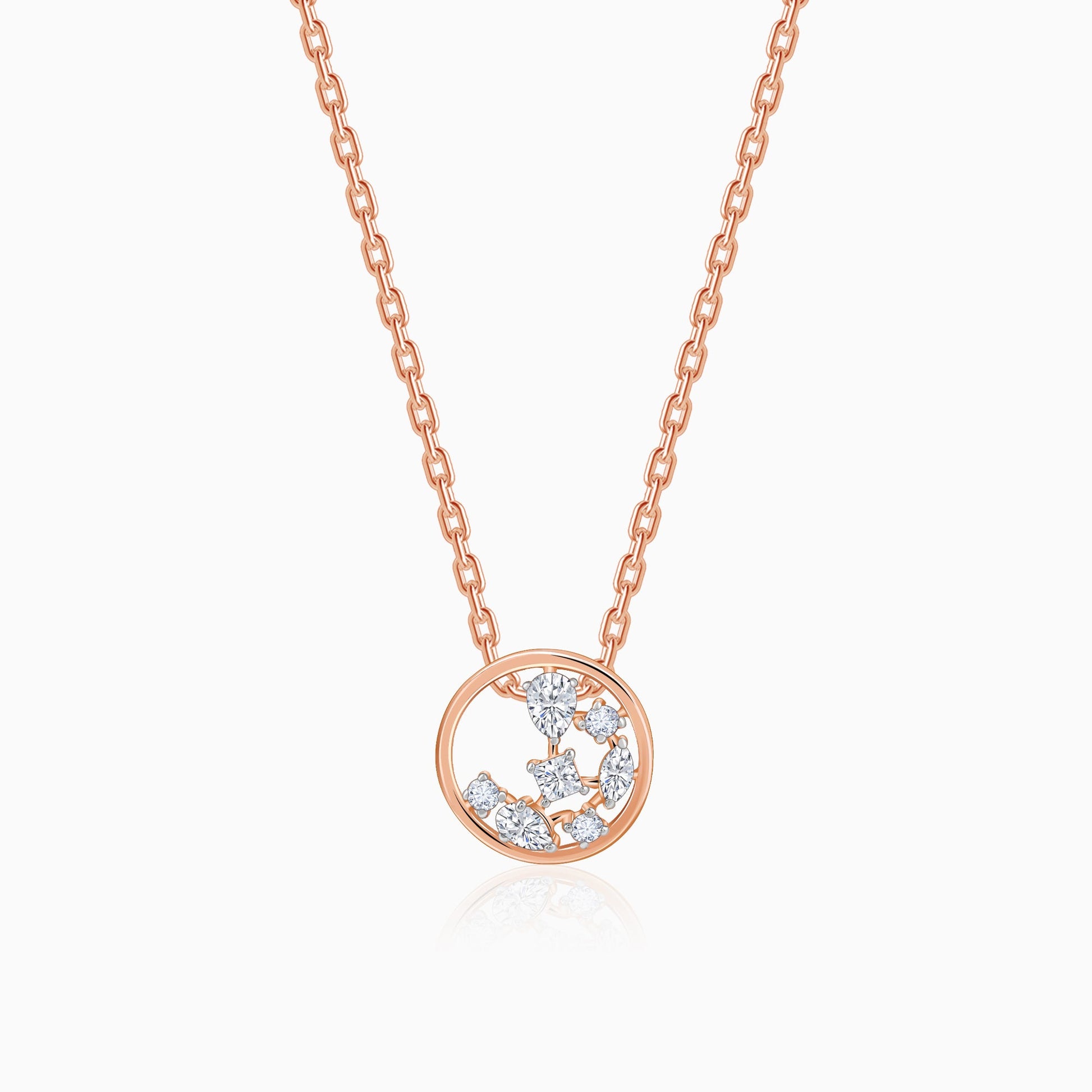 This pure rose gold necklace for women features a round frame. Two pear-cut, one maquise cut, one round-cut and two princess-cut lab grown diamonds are placed elegantly within.