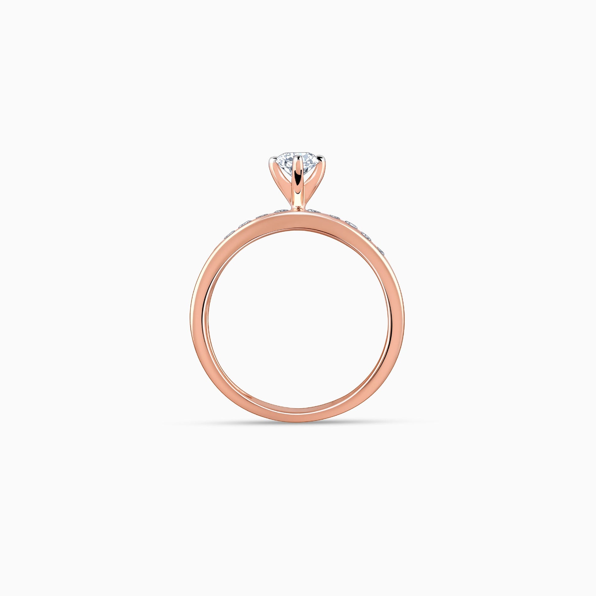 This pure rose gold ring showcases a row of lab-grown diamonds along the band, with a single diamond elegantly set at the centre.