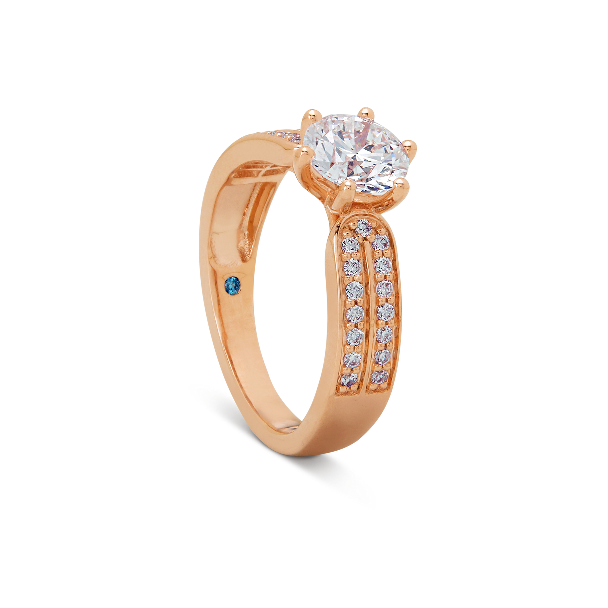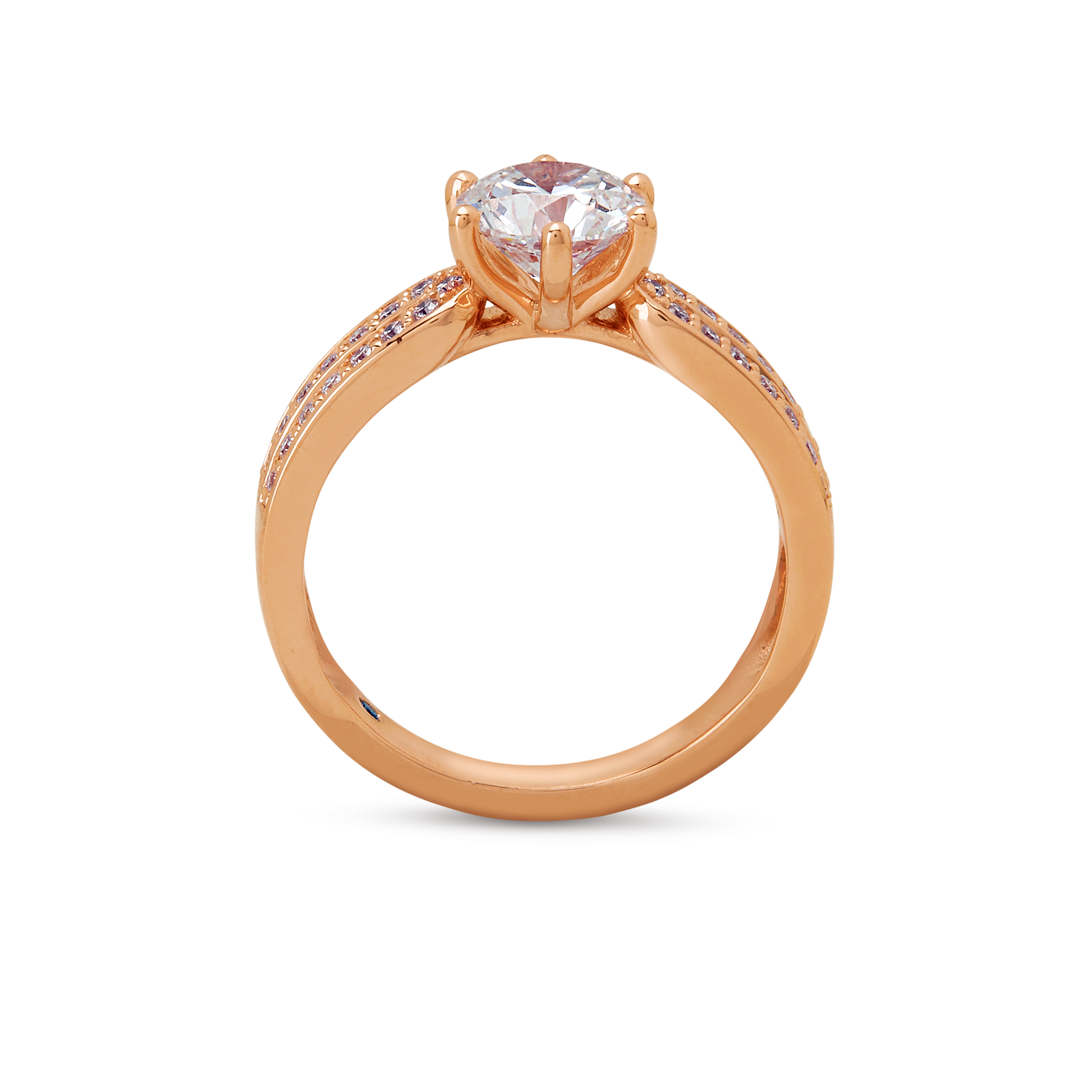 A brilliant round solitaire set in rose gold, its shoulders lined with twin pavé strands—where modern radiance meets timelessness.